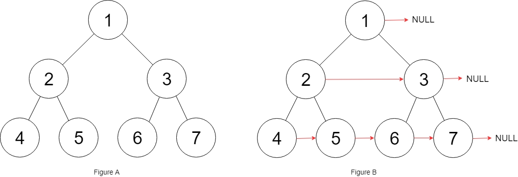 Explanation: Given the above perfect binary tree (Figure A), your function should populate each next pointer to point to its next right node, just like in Figure B. The serialized output is in level order as connected by the next pointers, with '#' signifying the end of each level.